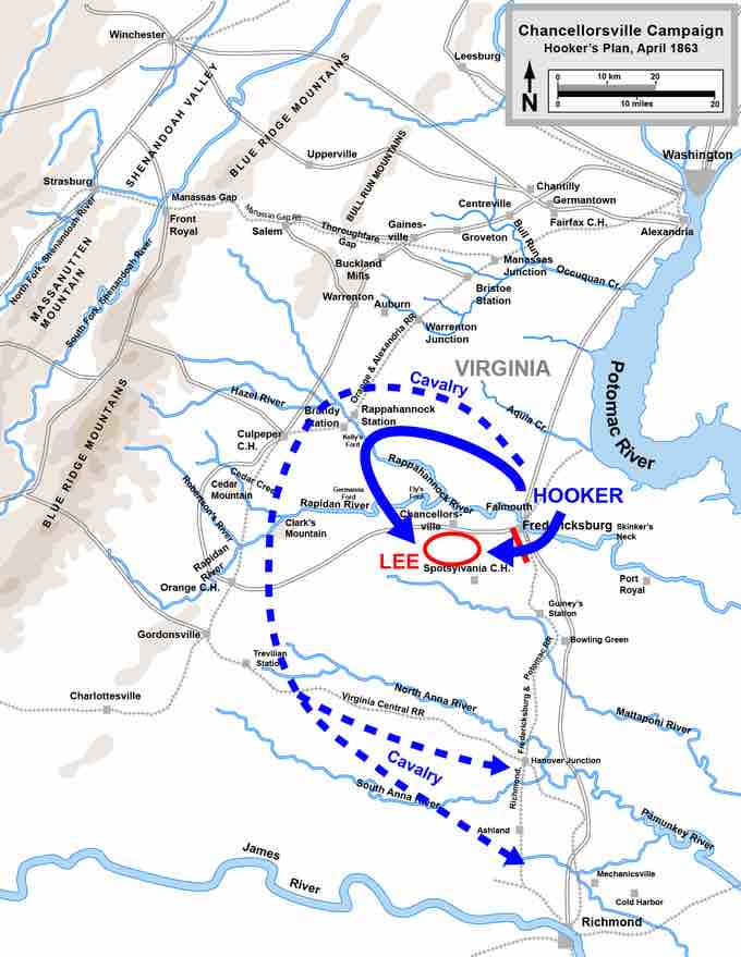 One of a series of maps of the Battle of Chancellorsville of the American Civil War. This one depicts the plan of Maj. Gen. Joseph Hooker prior to the campaign.