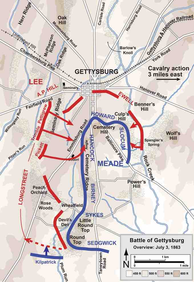 Overview map of the third day of the Battle of Gettysburg, July 3, 1863.