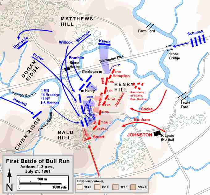 This figure shows the direction of Union attack and Confederate reinforcement at the First Battle of Bull Run.