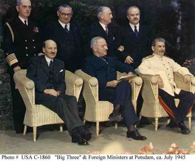 UK Prime Minister Clement Attlee, U.S. President Harry Truman and Soviet Premier Joseph Stalin at the Potsdam Conference, July 1945