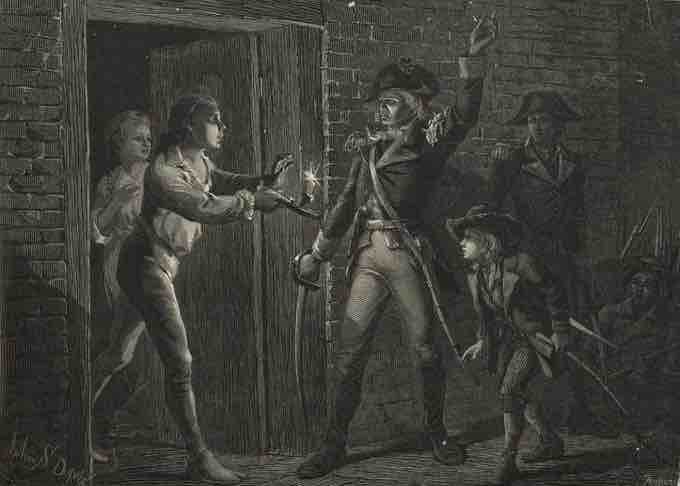 An 1875 print by John Steeple Davis giving an idealized and inaccurate depiction of Ethan Allen demanding the fort's surrender.