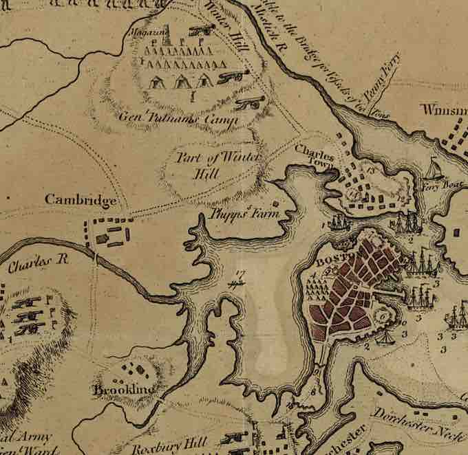 Detail of a 1775 map of Boston, with Dorchester Heights at the bottom right: "A plan of the town and harbour of Boston and the country adjacent with the road from Boston to Concord, shewing the place of the late engagement between the King's troops & the provincials, together with the several encampments of both armies in & about Boston. Taken from an actual survey. Humbly inscribed to Richd. Whitworth by J. De Costa; C. Hall, sc."