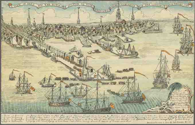 A view of the town of Boston in New England and British ships of war landing their troops in 1768