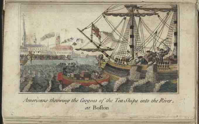 1789 engraving of the destruction of the tea in Boston Harbor.