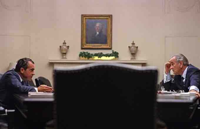 President Nixon inheriting a mixed legacy from President Johnson, including the unpopular Vietnam War and the ambitious Great Society programs.