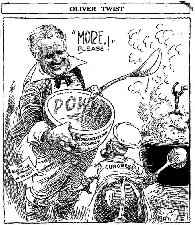 1937 cartoon by Joseph L. Parrish in the Chicago Tribunes warning FDR's executive branch reorganization plan is a power grab.