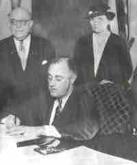 Francis Perkins, the Secretary of Labor in the Roosevelt administration, looks on as Franklin Roosevelt signs the National Labor Relations Act.