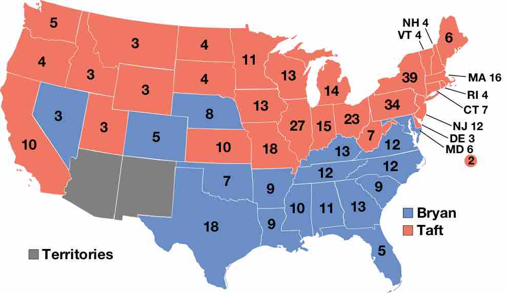This map showing the 1908 presidential election results uses blue to denote states won by Bryan/Kern, and red to denote those won by Taft/Sherman. The number of electoral votes are shown in each state. Bryan won all of the southern states, Texas, Nebraska, Colorado, and Nevada, while Taft won the rest of the Midwest, the Pacific states, and all of the northern states.