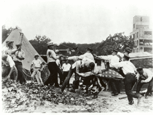 On July 28, U.S. Attorney General William D. Mitchell ordered the veterans to be removed from all government property. Washington police met with resistance, shots were fired, and two veterans were wounded and later died. Veterans were also shot dead at other locations during the demonstration . President Herbert Hoover then ordered the army to clear the veterans' campsite. Army Chief of Staff, General Douglas MacArthur, commanded the infantry and cavalry supported by six tanks. The Bonus Army marchers, with their wives and children, were driven out, and their shelters and belongings burned.