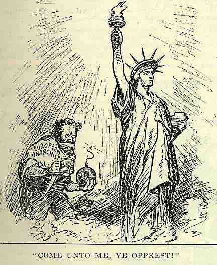 First Red Scare depiction of a "European Anarchist" attempting to destroy the Statue of Liberty.
