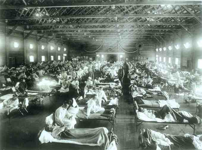 Soldiers from Fort Riley, Kansas are ill with Spanish influenza at a hospital ward at Camp Funston in 1918, where the worldwide pandemic is hypothesized by some to have begun.