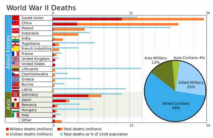 Estimates suggest that some 75 million people died in World War II, including about 20 million military personnel and 40 million civilians.