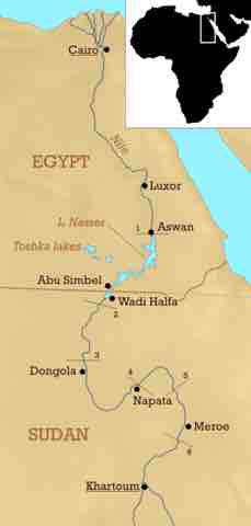 Nubia consisted of two major regions along the Nile River, from Aswan to Khartoum. Upper Nubia sat between the Second and Sixth Cataracts of the Nile (modern-day central Sudan), and Lower Nubia sat between the First and Second Cataracts (modern-day southern Egypt and northern Sudan).