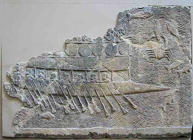 Assyrian warship (probably built by Phoenicians) with two rows of oars, relief from Nineveh, c. 700 BCE.