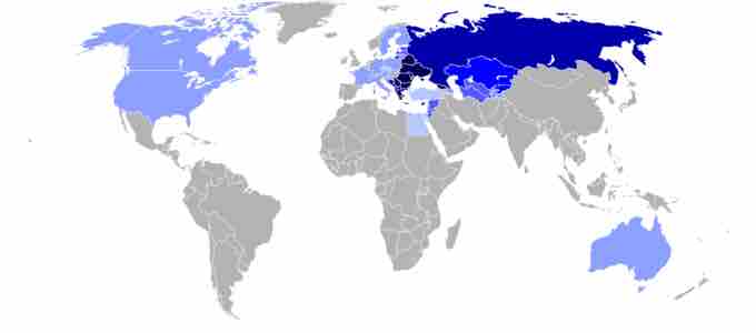 Distribution of Eastern Orthodox Christians in the world by country as of 2012. Darker blues indicate main religion (over 50%).