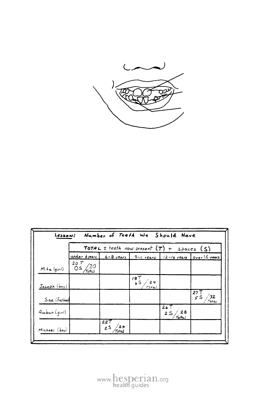 * Here the children are only counting the teeth. They can also learn to check for cavities and