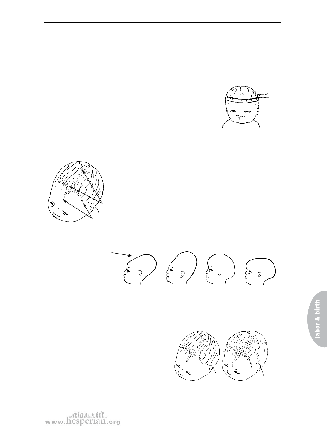 at or near the top of the forehead. Notice if the sutures are a normal width or